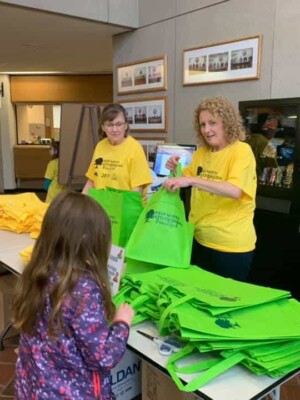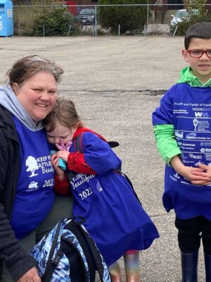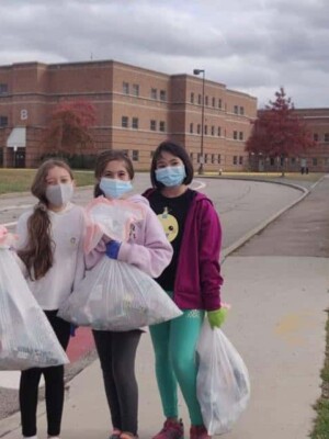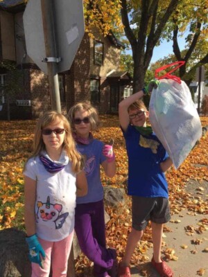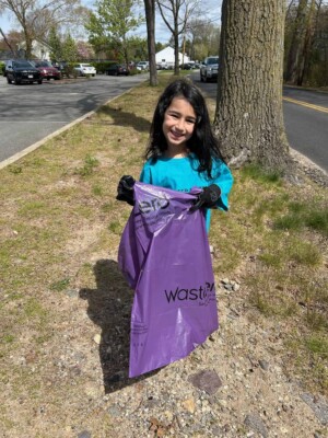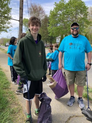 A group of volunteers, consisting of children and adults, are engaged in a cleanup activity along a sidewalk, collecting trash and promoting environmental awareness as part of the Great America Cleanup 2025 organized by Keep North Attleborough Beautiful.